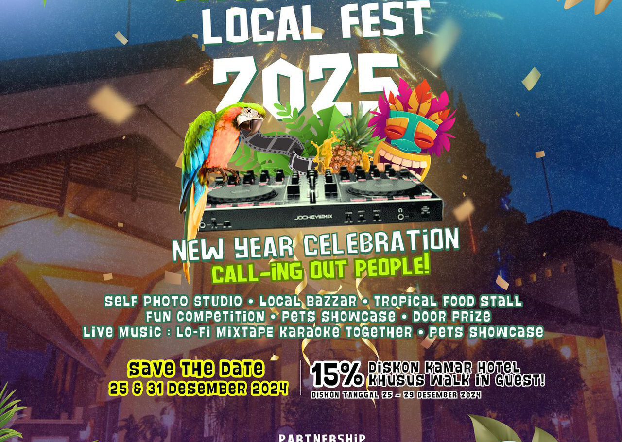 Trophy-Cal Local Fest 2025 at Sangga Buana Resort & Convention Hotel invites you to a vibrant New Year celebration on December 25 & 31, 2024. Enjoy a tropical-themed event with local bazaars, food stalls, fun competitions, pets showcase, live music, karaoke, and exciting door prizes. Walk-in guests can enjoy a 15% hotel discount from December 25–29, 2024. Save the dates for an unforgettable festive experience!